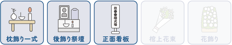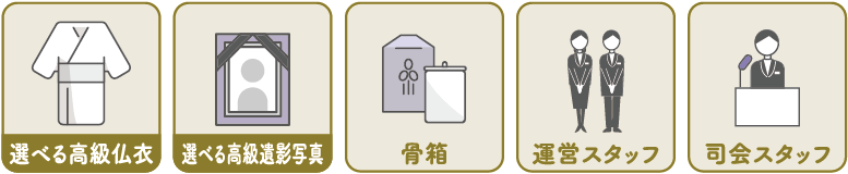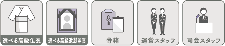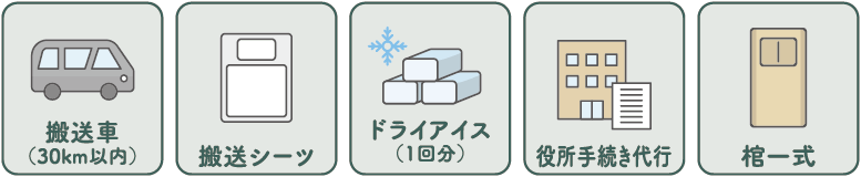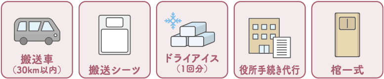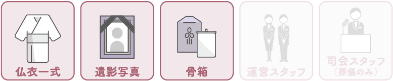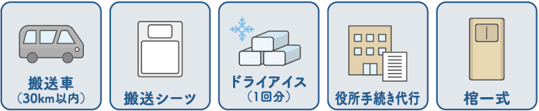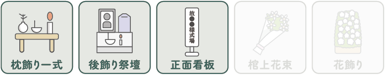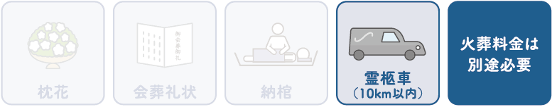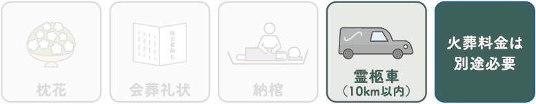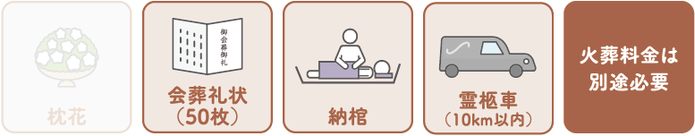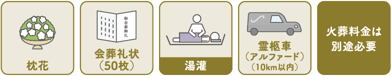 - 規定の搬送距離や安置日数を超える場合、付き添い安置をご希望される場合、規定の日数を超えて式場を使用される場合、ご遺体 の状態が良くない場合、ブラン内容を超える物品やサービスを希望される場合など、別途費用が発生いたします。火葬料、宗教者 へのお布施などは含まれていません。