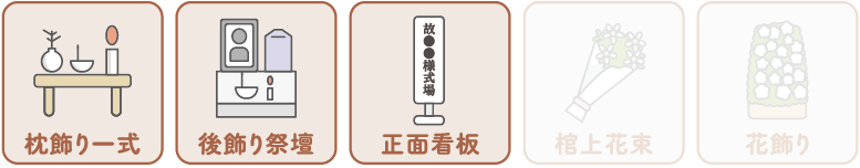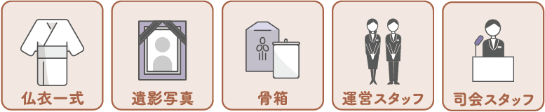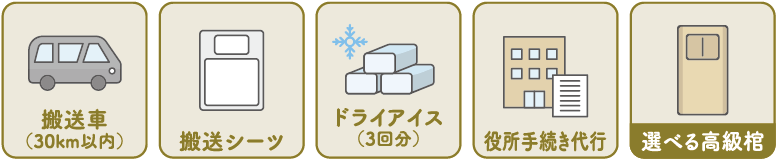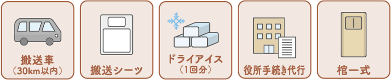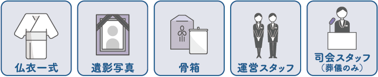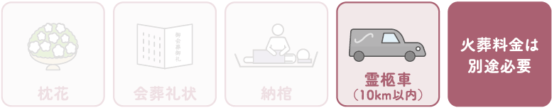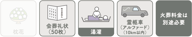 - 規定の搬送距離や安置日数を超える場合、付き添い安置をご希望される場合、規定の日数を超えて式場を使用される場合、ご遺体 の状態が良くない場合、ブラン内容を超える物品やサービスを希望される場合など、別途費用が発生いたします。火葬料、宗教者 へのお布施などは含まれていません。